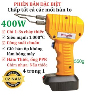 6. Mẫu 400W: BH 02 năm, kết nối được với điện thoại qua Wifi chỉnh được công suất và thông số, đây là dòng CAO CẤP, phù hợp với các anh em thợ làm dịch vụ sửa chữa chuyên nghiệp thường xuyên xử lý các mối hàn rất to có mức tản nhiệt lớn, tần suất hàn nhiều. Sử dụng được 04 chức năng: hàn thiếc, hàn nhựa, nấu thiếc, hàn ống nhựa PPR.